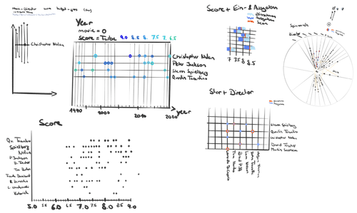 I focused mainly on directors because I find guiding questions in this context exciting. I thought about sorting the films on the x- and y-axis in a grid according to director and star. I find it interesting to see whether certain directors have made more films with a leading actor. I find this idea exciting, but it's problematic to implement it via the distribution on the x- or y-axis, as it would only make sense to include directors and leading actors who have often made films together and this would limit my data set too much. I would like to visualize this factor in a different way.