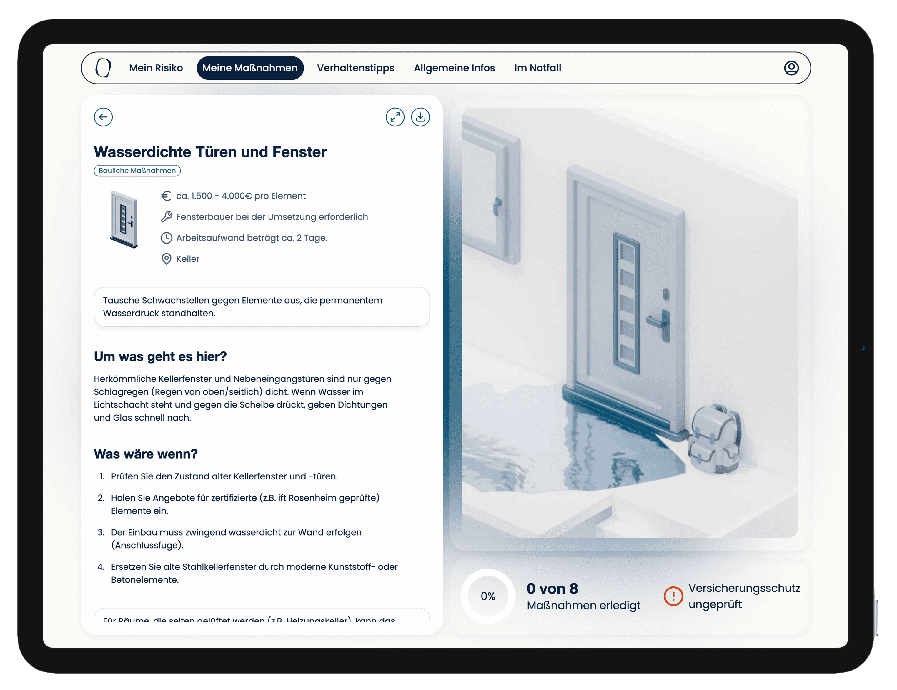 Prioritized action plan: Obacht creates a customized action plan categorized by structural, financial, and behavioral measures. To bridge the “knowledge-action gap,” contextual animations on the digital twin visualize potential damage, creating a compelling psychological incentive for proactive prevention.