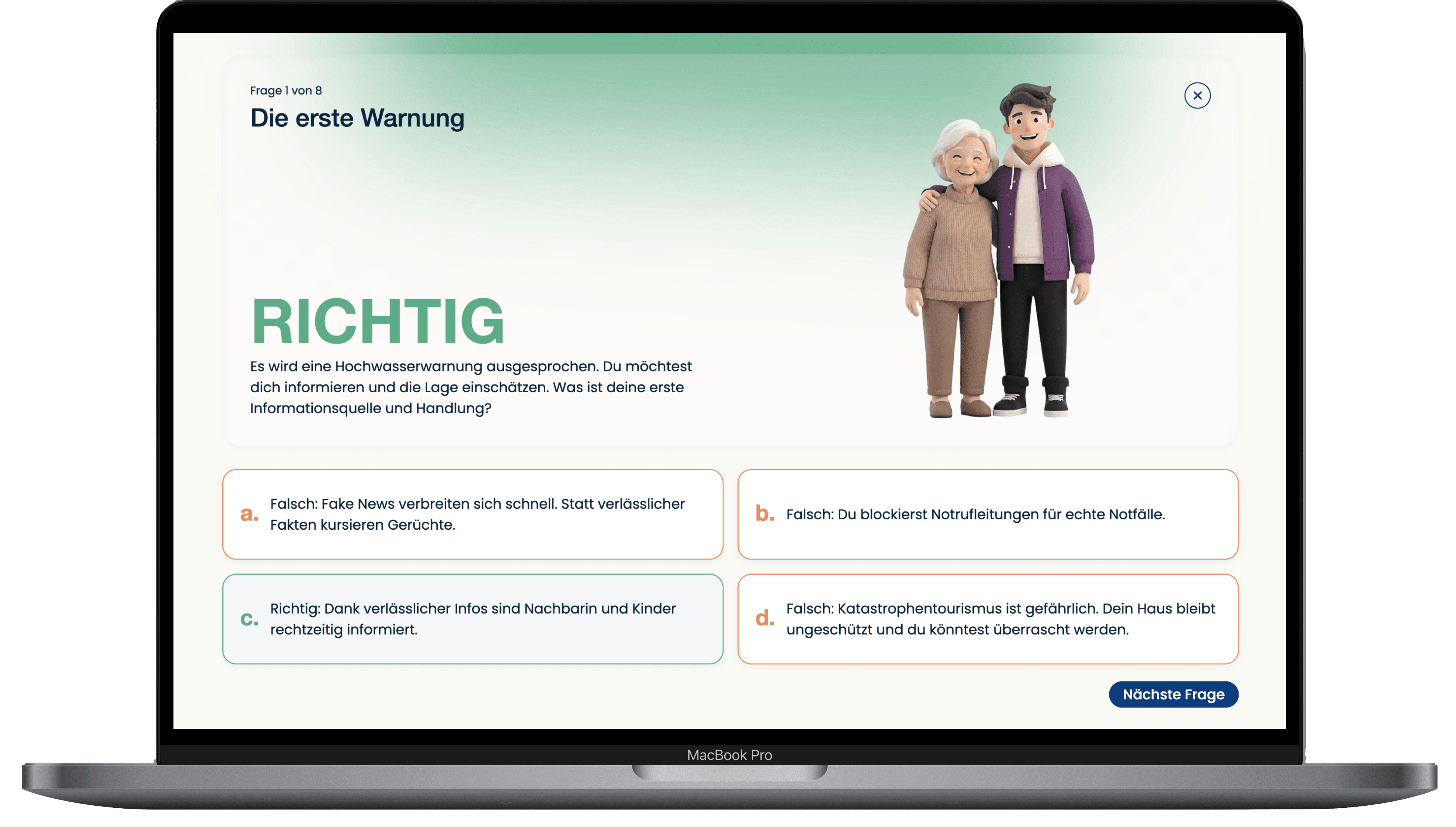 Behavioral nudges: The user interface shifts the focus from the disaster itself to the solution and breaks down complex prevention measures into small, manageable steps.