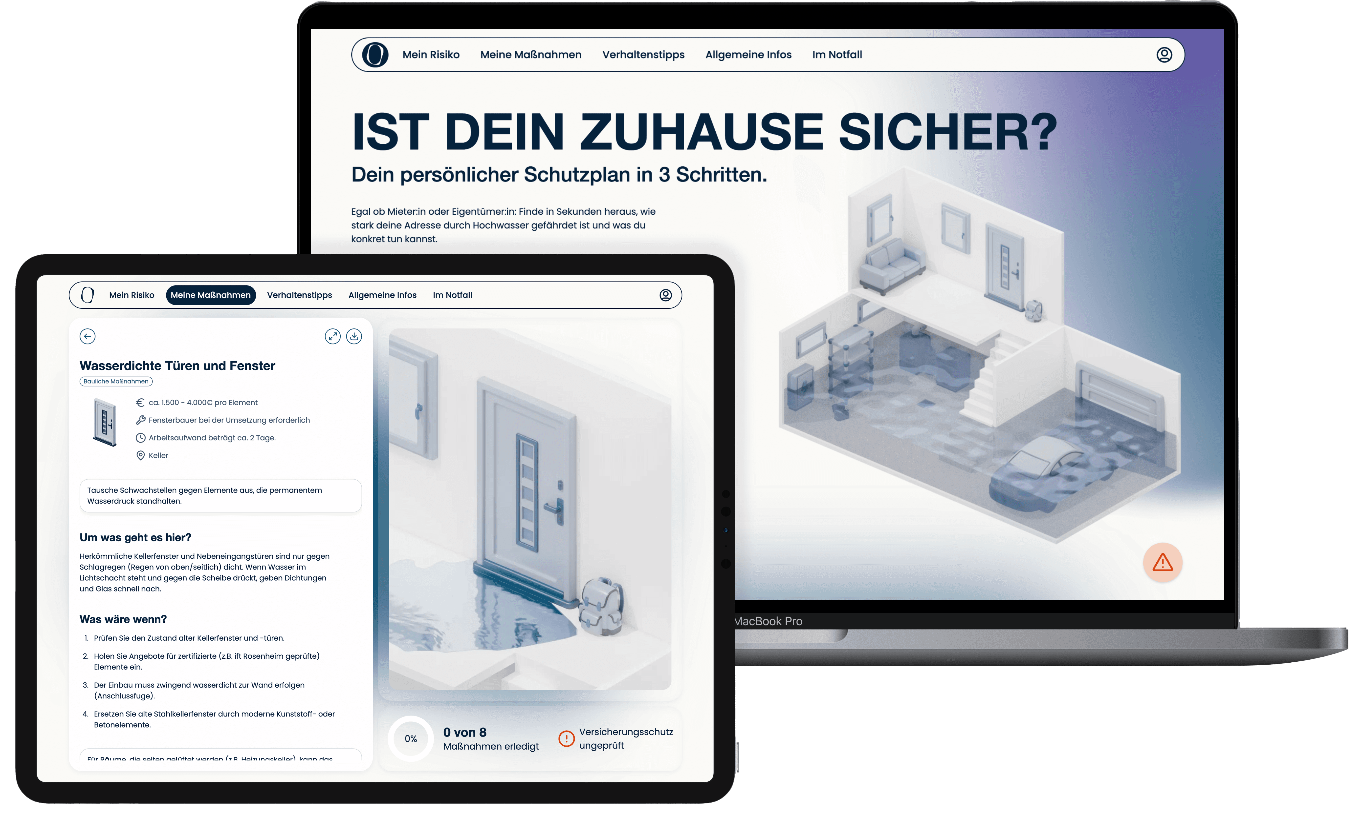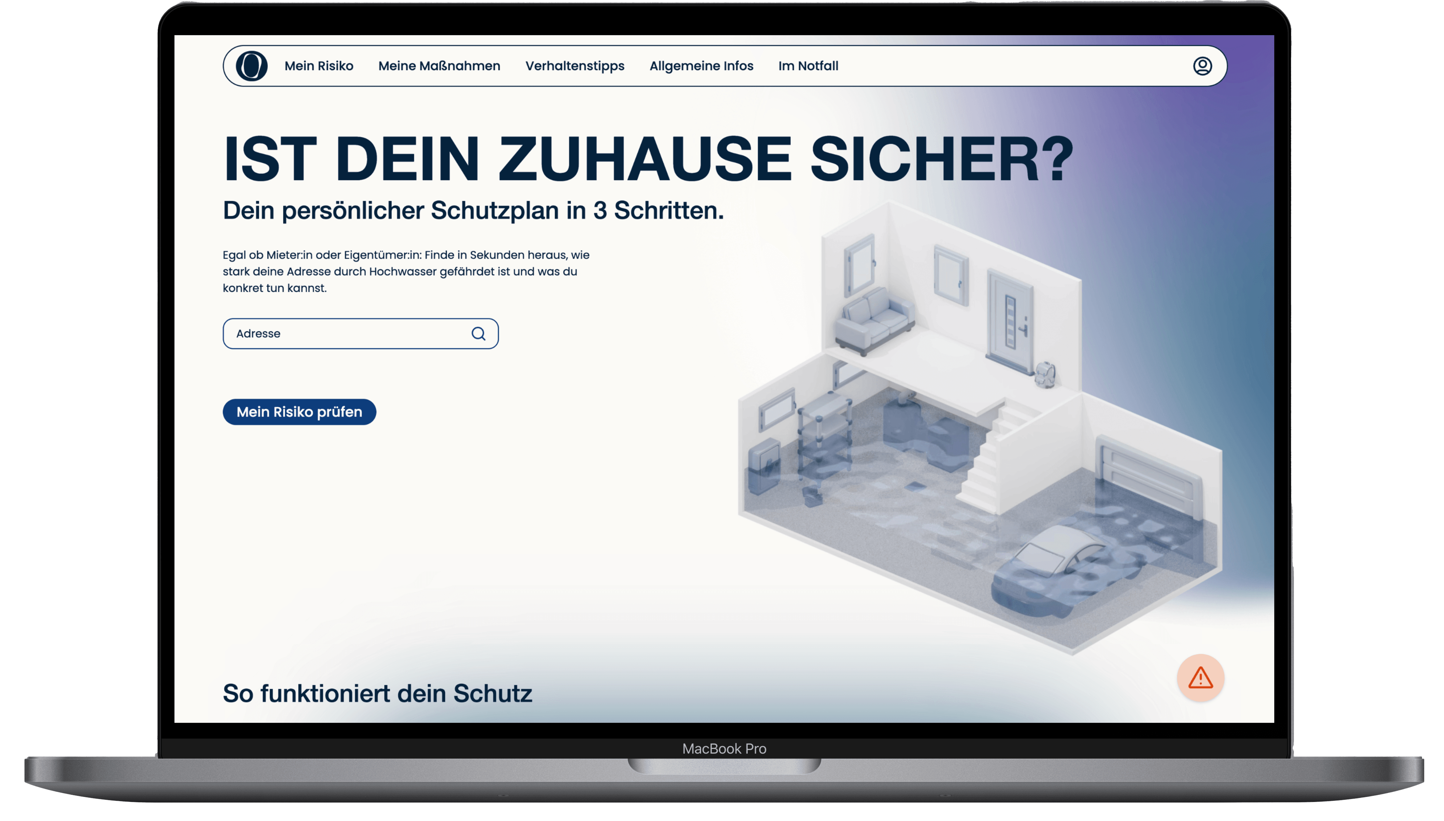 After entering their address, users receive an immediate risk analysis. To make abstract water levels understandable, the user interface uses a human reference figure in front of a house model, providing an instinctive, intuitive sense of the physical danger.
